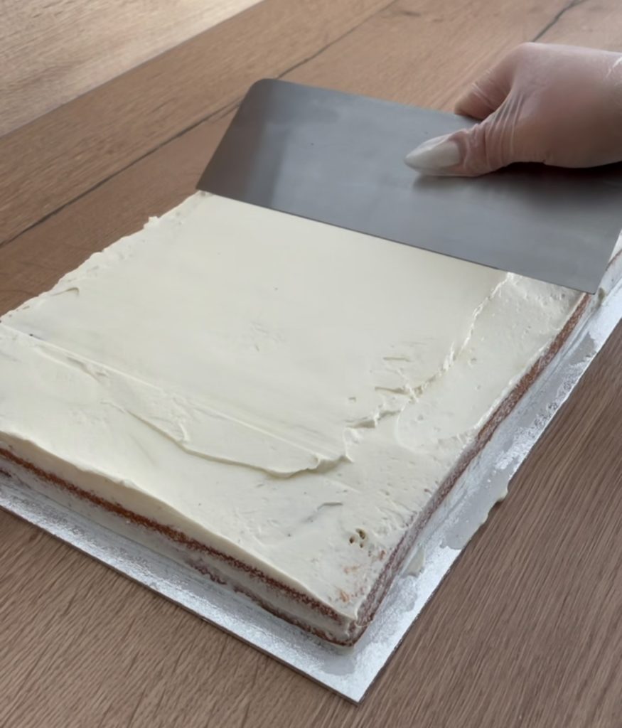 3. Recouvrez le dessus du gâteau de crème au beurre blanche, puis lissez à l’aide d’un lisseur à ganache. Placez le gâteau au frais pendant 10 minutes afin que la crème fige sur le dessus.