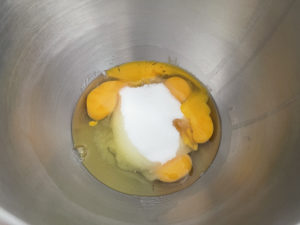 1. Dans le bol du robot pâtissier, mélangez à vitesse moyenne les œufs, le sucre et la vanille liquide jusqu’à ce que la préparation épaississe.