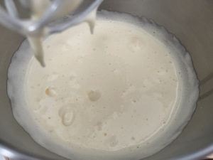 3. Ajoutez en 4 fois la préparation de l’étape 1. Attendez bien que le mélange soit incorporé à chaque fois.