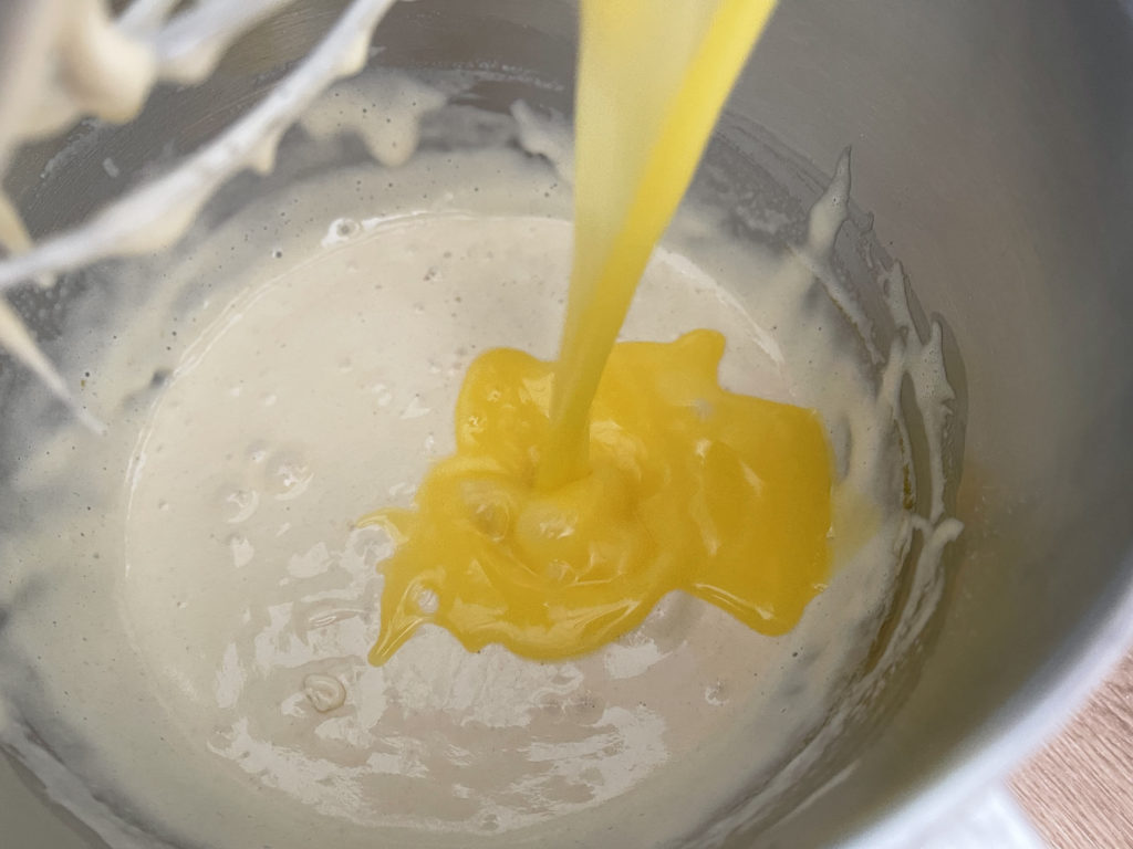 3. Une fois que la préparation est homogène, ajoutez le beurre fondu et la vanille. Mélangez.