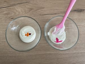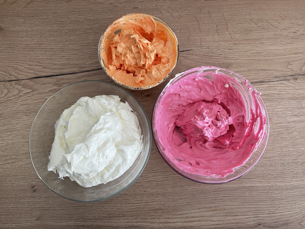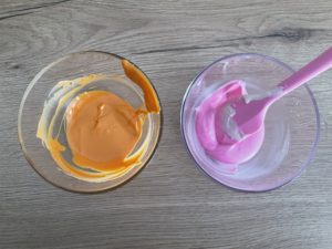 5. Versez la crème dans plusieurs bols afin de la colorer (1 bol par couleur). Ici nous avons opté pour du rose fuchsia, du blanc et du orange.