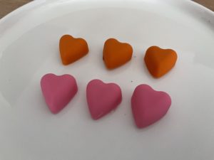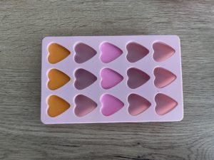 2. Versez le candy melts dans les cavités du moule cœurs en silicone, puis placez au frais. Une fois que le candy melts est figé, démoulez les coeurs et réservez.